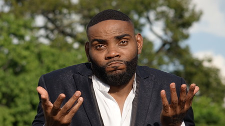 beaten man of color with fist in his face looking down white background - waist up shot. High-quality photo