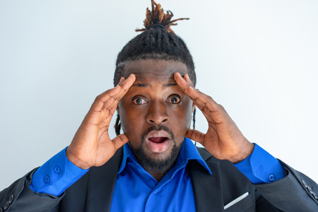 Amazed black man with Afro hairstyle holding head in hands and looking at camera. Surprised young African man with open mouth. Wondering concept