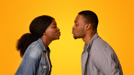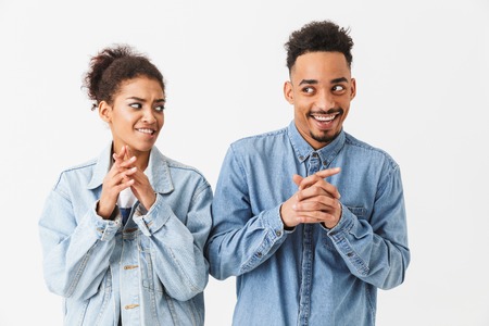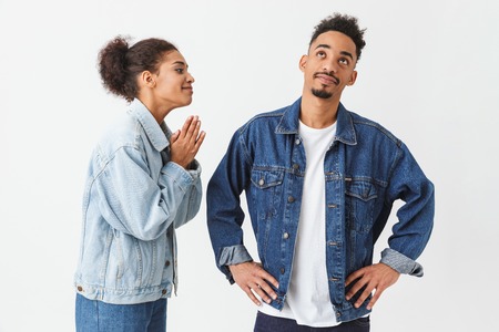 Two young black men with dark skin smiling and talking together in casual clothes on white background. Friendship, communication and positive interaction between friends.