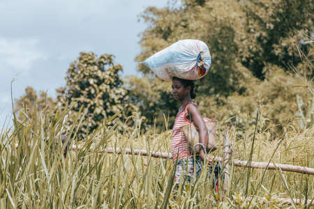 MAROANTSETRA, MADAGASCAR OCTOBER 20.2016: Malagasy woman carry heavy loads on head. The traditional method of transport of goods in Africa. October 20. 2016, Madagascar