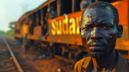 Portrait of a sad Indian man with dirty face in front of a train. Sudan