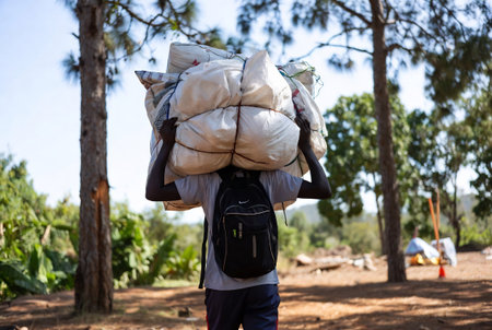 Rear view of a man carrying a stack of bags in the countryside