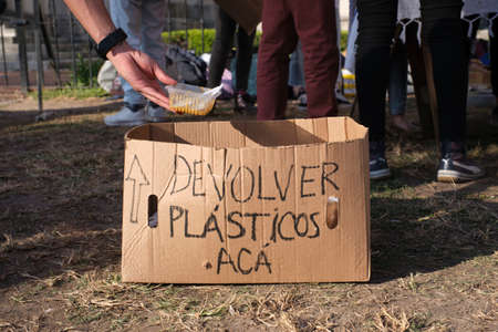 Buenos Aires, Argentina; April 22, 2022: Hand leaving a disposable food container in a box to collect used plastics during an environmental demonstration. Concepts of recycling and reuse.