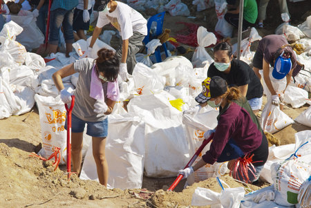 Bangkok THAILAND - OCT 31: Thai volunteers made sand bags for protecting Bangkok from flood on October 31,2011 in Bangkok Thailand