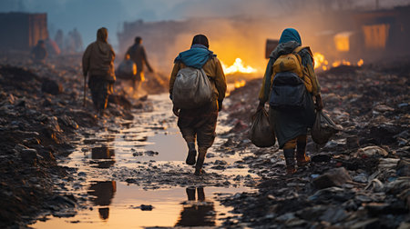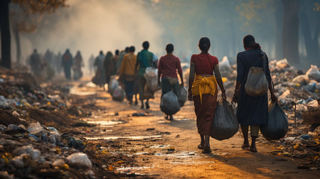 Homeless, poor people picking up garbage with cloth bags in a garbage dump
