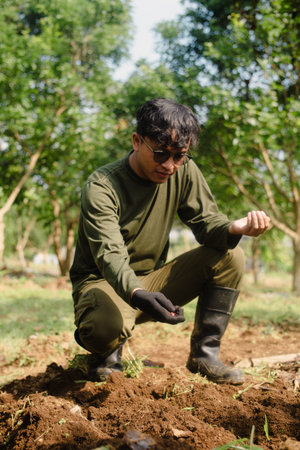 A peanut farmer placing peanut seeds into the soil by hand during the planting process. Traditional farming activity in rural agriculture.
