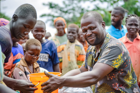 A vibrant scene capturing a woman smiling as she distributes water bottles to eager children, highlighting community solidarity and support in rural Africa.