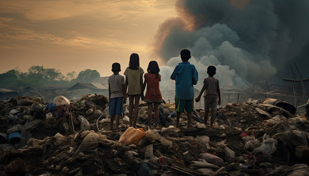 children standing in front of a garbage pit.