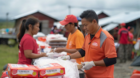 humanitarian workers as they coordinate relief efforts in disaster zones, capturing the spirit of compassion and resilience amidst adversity