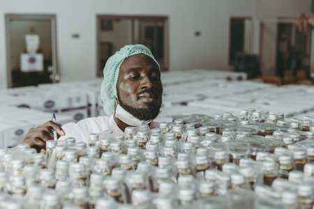 Black African worker working in industry factory products checking inventory stock in the warehouse.