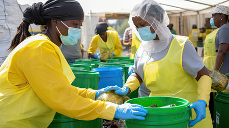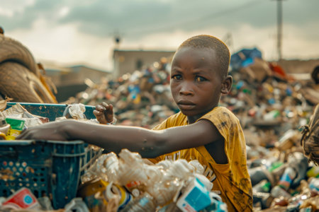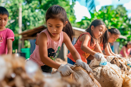 Children work together in a sunlit setting, sorting through waste and recycling materials. Their determination highlights the importance of teamwork in keeping the community clean and green.