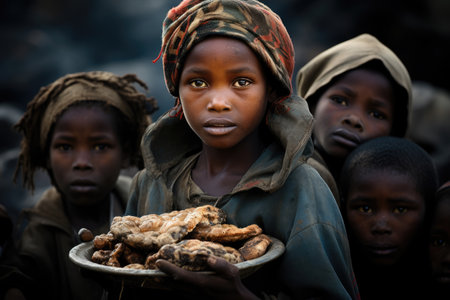 large community of families and children eating at refugee camp is borderline and sad situations generative ai art