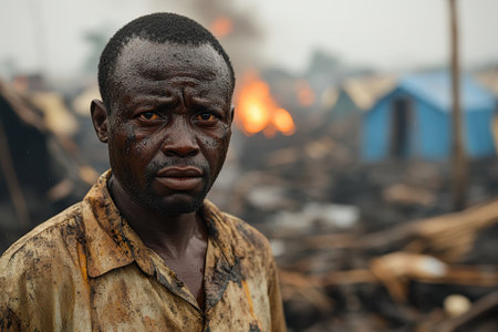 A middle-aged Liberian man stands near a burned-out building, mud on his face. His expression shows exhaustion and resilience amid scattered debris and makeshift tents, highlighting the aftermath.