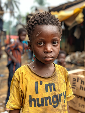 A lonely child in a yellow shirt stands in line with other children, surrounded by makeshift homes and greenery, evoking emotions of sadness and isolation