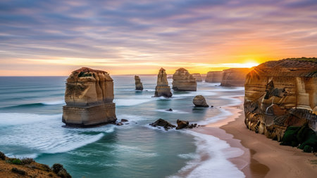 AI Generated. Majestic Twelve Apostles at Sunrise Along the Great Ocean Road with Serene Seascape and Ample Copy Space for Custom Text