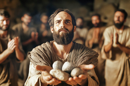 In a dramatic moment of healing, Jesus stands with open hands, offering hope to a paralytic, while men kneel around him, evoking deep emotional connection and reverence.