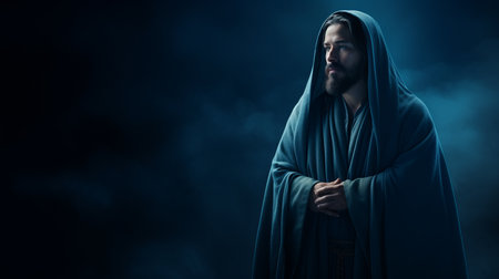 A tranquil figure stands against the glowing twilight of Jerusalem. Draped in deep robes, he gazes thoughtfully towards the ancient city as lights twinkle like stars.