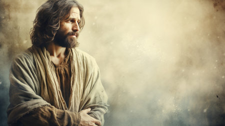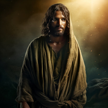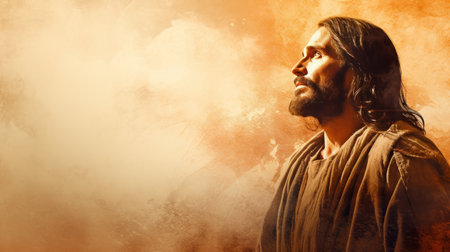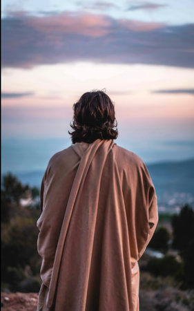 Portrait of Jesus Christ in his traditional white robe against sunset sky background.