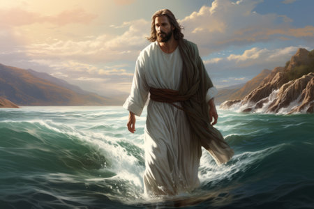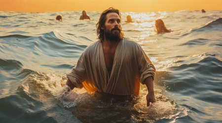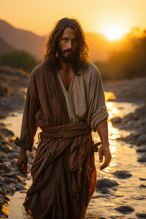 Portrait of Jesus Christ walking on the bank of the river at sunset.