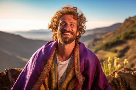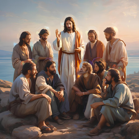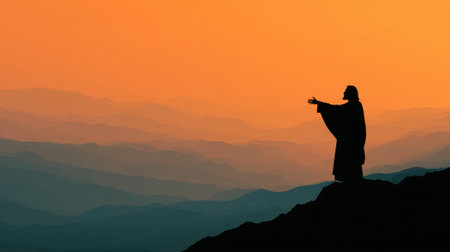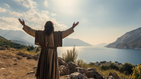 Jesus speaking to the people by parables on the mountain in the midst of nature Generative AI Illustration.