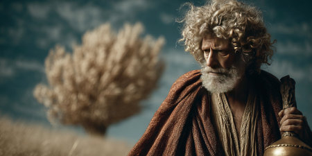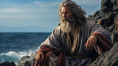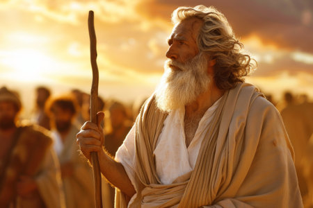 Biblical Scene of Bearded Man Moses Holding Staff by the Sea Concept of Faith Determination Spiritual Leadership Inspirational Moments.