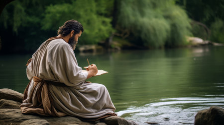 Toga-clad poet composing verses by tranquil river robe mirroring gentle flow