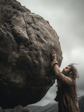 Sisyphus is pushing a rock up a mountain. The enduring symbolism of sisyphus pushing a rock up a mountain: a representation of eternal effort, mythological punishment, and philosophical reflection