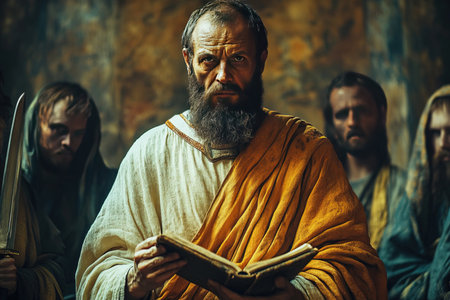 In a dimly lit setting Apostle Paul stands before his attentive disciples reading a heartfelt prayer from a book.