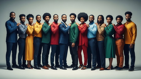 A diverse group of individuals stands closely together in a studio, each wearing vibrant clothing. The expressions convey unity and confidence among friends.