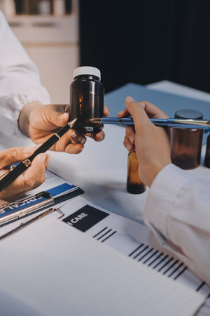 Female doctor holding a medicine bottle is checking the quality of medicine for any side effects the patient or not and recording patient information at the hospital. medical and health care concept
