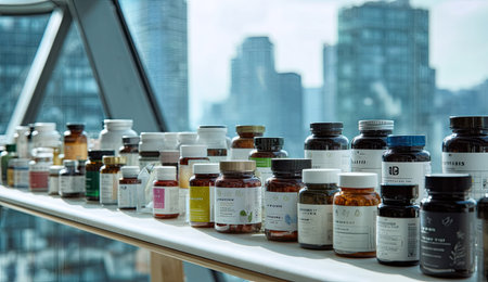 A collection of medicine bottles and pills are on a table. The bottles are of various sizes and colors, and the pills are scattered around them. Concept of organization and attention to detail