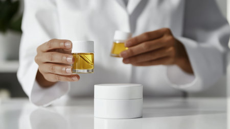 A person in a lab coat holds small glass bottles containing golden liquid, showcasing a sterile and modern skincare environment focused on beauty and wellness.