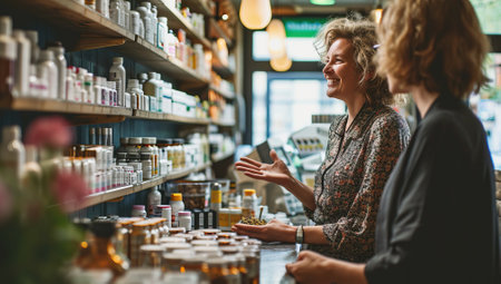 A pharmacy counter with pharmacists explaining medication usage to a patient and shelves stocked with medicines