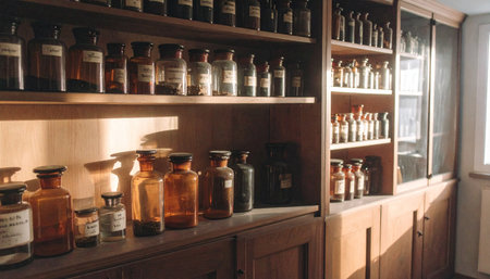 Charming apothecary shelves brimming with vintage bottles and jars create a warm, inviting, and nostalgic atmosphere.