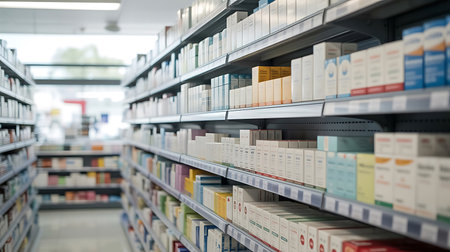 Brightly lit pharmacy aisle with shelves filled with medications and healthcare products, creating a modern and organized retail space.