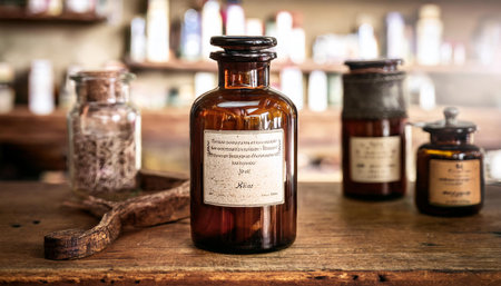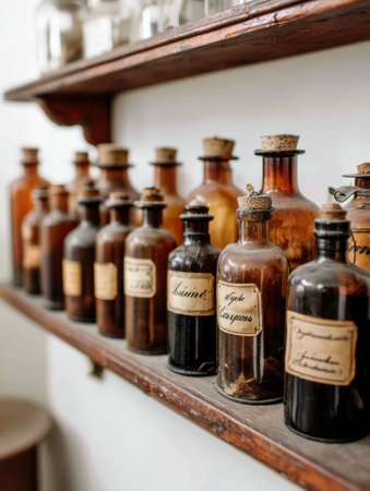 A unique shelf filled with various vintage brown glass bottles, each carefully labeled, showing the charm of a historical apothecary in a warm setting.