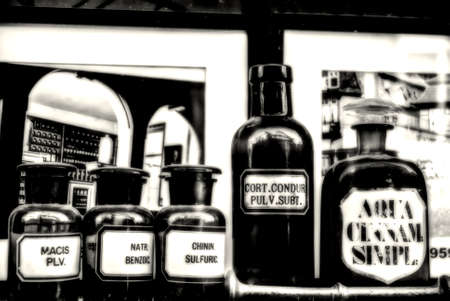 Medicine bottles on shelf, Sherbrooke, Nova Scotia, Canada