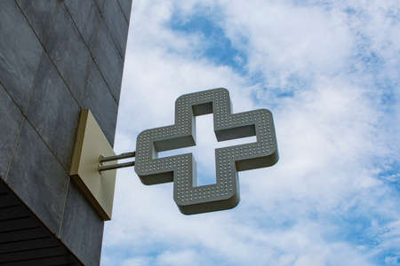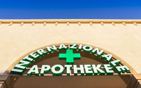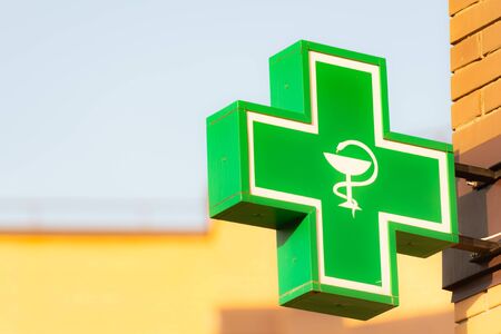 Italian Pharmacy Sign and Shop. Pharmacy sign in German language. Green color teaches.