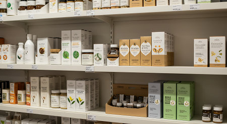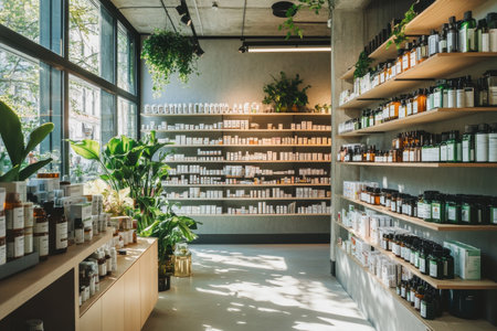 A modern apothecary shop interior with shelves filled with natural products under warm lighting, creating a tranquil and eco-conscious shopping atmosphere.
