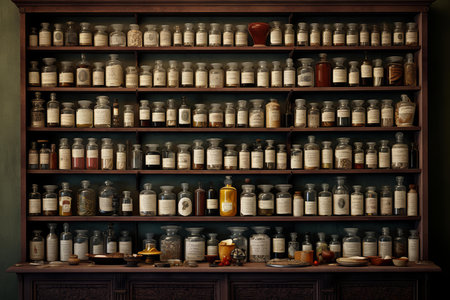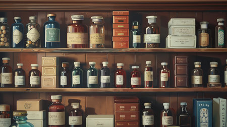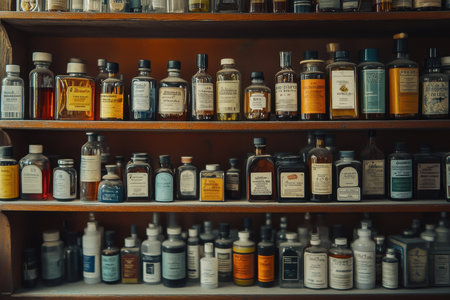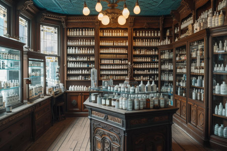This photo captures a spacious room brimming with a multitude of bottles arranged in an organized manner, The interior of a vintage Victorian-era pharmacy, AI Generated