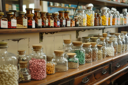 A pharmacy shelf displaying numerous bottles filled with colorful candy, A pharmacy counter with assorted pills and bottles