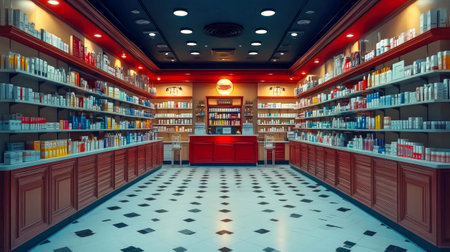 Interior view of a contemporary pharmacy shop with clean and empty aisles for a modern look