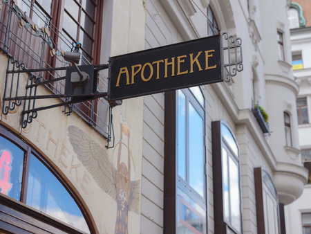 Vienna, Austria - August 11, 2022: Close up of an Apotheke pharmacy . Symbol for health, medicine and medical supplies.