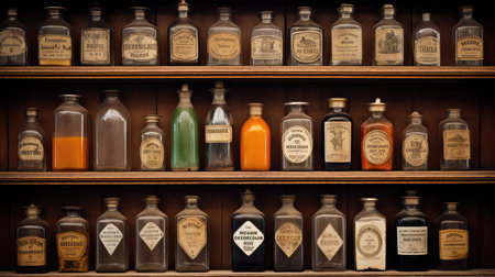 A wooden shelf filled with a diverse array of glass bottles containing remedies and potions, all displayed under warm, inviting light, evoking a sense of nostalgia.