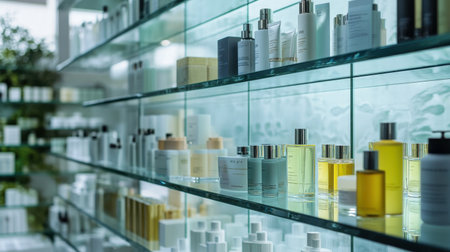 A visually appealing arrangement of skincare bottles on glass shelves in a beauty store, showcasing a variety of products in a serene and modern setting.