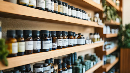 A display of various natural products in brown glass bottles and jars on wooden shelves in a rustic shop, emphasizing an organic and eco-friendly aesthetic. Perfect for themes of wellness and sustainability.