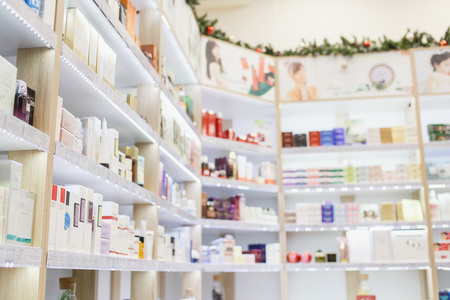 Blurred image of cosmetic products on shelf in beauty shop,vintage color