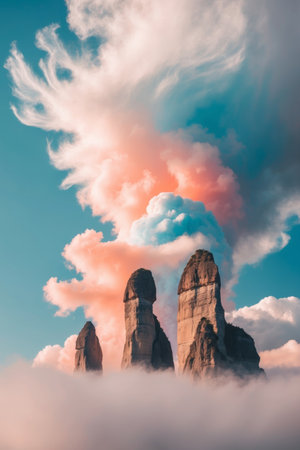 AI Generated. Tall Rock Formations Emerging from Colorful Clouds