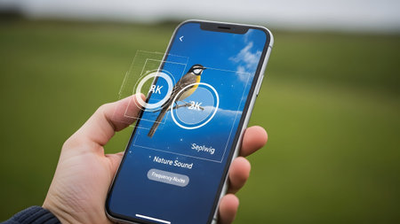 Identification showing close-up of hand holding smartphone displaying bird identification app...