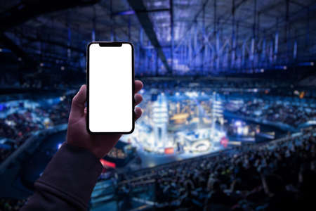 Gamer using smartphone during big esports gaming event sitting on the tribunes inside the arena. Blank screen with copy space mockup
